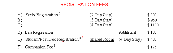 - Student/Post Doc Registration (4 day stay)(E): Includes all of the above excluding the proceedings and requires sharing a room.