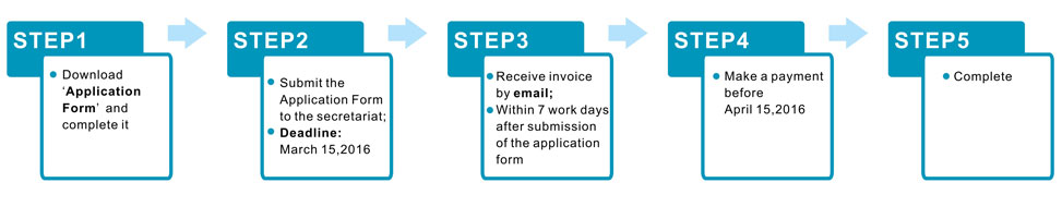 Upon receipt of the signed application form, an invoice covering payment amount will be issued by e-mail. Then the payment should be made in full amount within 1 month of signing the application form and before April 15, 2016.
